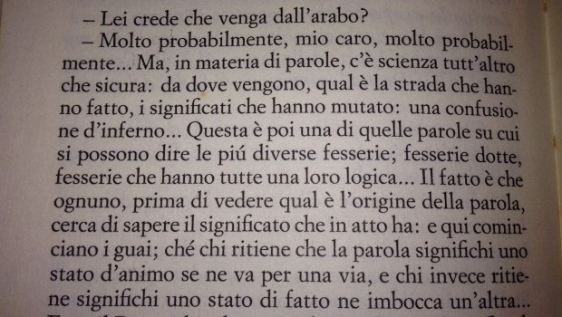 Il notabile, con aria da filologo e avvocato, in vista della chiamata della Commissione, cercava d’istruire il suo compare sulla vasta letteratura riguardante l’etimologia del termine mafia per dare un piccolo contributo alle indagini, «un contributo alla confusione… si capisce».