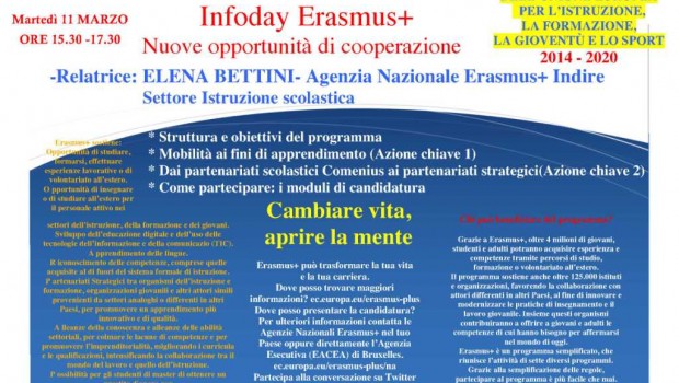 Il secondo dei quattro appuntamenti messi in cantiere, fissato per l’undici marzo (dalle 15.30 alle ore 17.30), avrà per oggetto “Erasmus plus: il nuovo Programma europeo a favore dell’istruzione, della formazione, dei giovani e dello sport”.