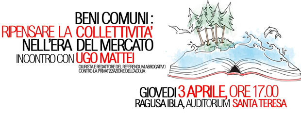 In un’epoca di profonda crisi sociale ed economica, la riscoperta dei Beni Comuni rappresenta un passo fondamentale verso una società più democratica e più giusta, basata su un uso collettivo e responsabile delle risorse fondamentali alla nostra vita”. Così i ragazzi della Scuola della Decrescita di Ragusa introducono l’iniziativa che si terrà Giovedì 3 Aprile presso l’Auditorium Santa Teresa: una tavola rotonda con il Professor Ugo Mattei sul tema dei Beni Comuni.