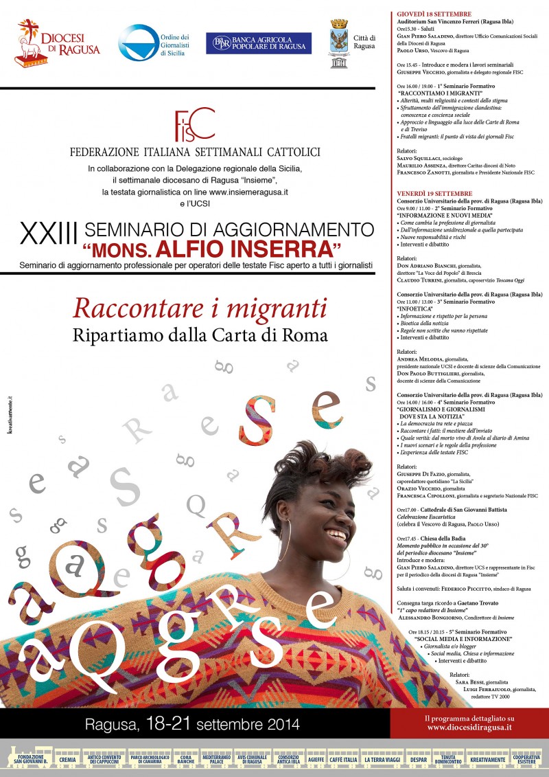 L’evento è promosso ed organizzato dall’Ufficio comunicazioni sociali della diocesi di Ragusa in stretto accordo con la FISC nazionale diretta da Francesco Zanotti e la delegazione regionale guidata da Giuseppe Vecchio. Collaborano alla realizzazione degli eventi anche l’Ordine regionale dei giornalisti, la redazione di Insieme, che, proprio nei giorni del seminario festeggerà con la pubblicazione di un numero speciale il proprio trentesimo anno di pubblicazioni. I seminari formativi prenderanno il via giovedì 18 settembre alle ore 16 con l’appuntamento “Raccontiamo i migranti” presso l’auditorium San Vincenzo Ferreri di Ragusa Ibla.