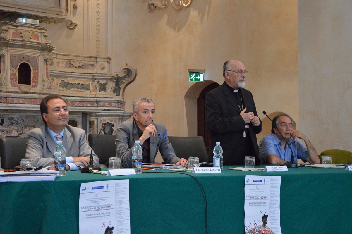 “Grazie a quanti sono venuti a Ragusa – afferma il vescovo S. E. Paolo Urso – in una comunità che spera, lavora, soffre e che non aspetta Godot né altri. Sono orgoglioso di essere vescovo di questa chiesa che incontrerete negli edifici di culto, ma anche nelle strade e tra la gente. Una chiesa attenta alle persone e a quello che sta avvenendo. Cambiamenti che essa stessa si preoccupa di sollecitare. L’accoglienza fa parte del dna dei siciliani. Non vogliamo avere sguardo e respiro corto. Vogliamo essere comunità capace di guardare lontano, pur nella consapevolezza della nostra piccolezza. Raccontare i migranti, ma a chi? Alla gente, alle comunità, a coloro che hanno la preoccupazione della gestione delle nostre città. Vogliamo raccontare a chi talvolta sembra essere sordo. Ma perché raccontare? Raccontiamo la loro presenza perché siano conosciuti, perché il fenomeno sia noto nella maniera più corretta possibile e si trovino sistemi validi e significativi per offrire a gente disperata motivi affidabili di speranza. Desideriamo raccontare con equilibrio evitando ricorso a battute e slogan che non costruiscono alcunché. Noi vogliamo raccontare i migranti con equilibrio, consci della complessità e vastità del fenomeno. Ma intendiamo farlo sempre con passione”.