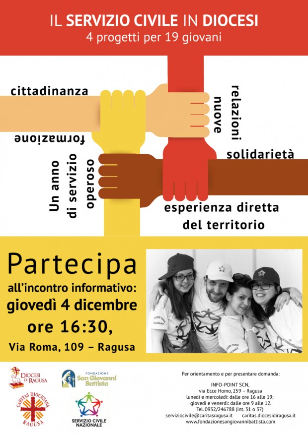 Un incontro informativo aperto a tutti i giovani interessati si terrà a Ragusa, nel saloncino del Vescovado (via Roma, 109) giovedì 4 dicembre alle ore 16:30. Saranno illustrati i progetti, le modalità di presentazione della domanda ed i criteri di selezione degli enti.