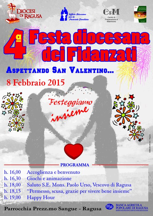 E’ giunta alla quarta edizione la Festa diocesana dei fidanzati, che prevede l’incontro con il Vescovo, mons. Urso, momenti di riflessione, animazioni, giochi e una dolce conclusione.