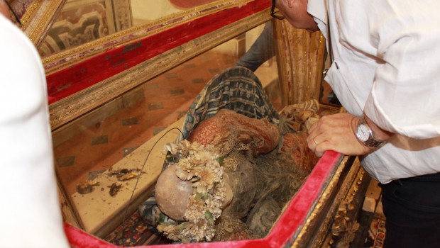 Alla presenza del Parroco, del Cancelliere Diocesano, di un rappresentante della Diocesi, del notaio e di medici e esperti tecnici si è proceduto all’estrazione del Corpo del Santo per la disinfestazione dello stesso e dell’urna.