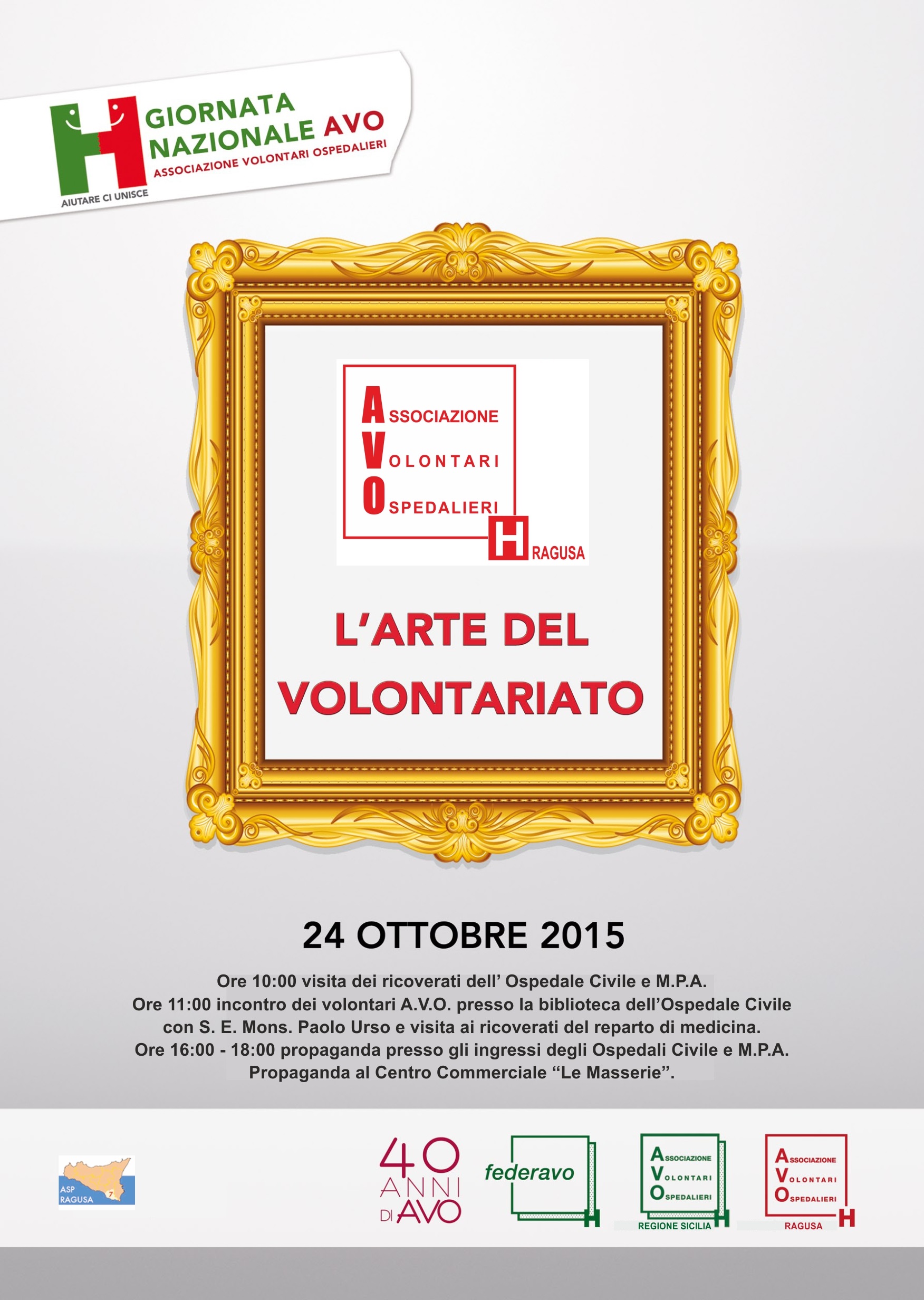 Il 24 Ottobre si celebra la giornata nazionale dell’Associazione Volontari Ospedalieri, “L’arte nel Volontariato”, nella quale è previsto un incontro con i volontari AVO e mons. Paolo Urso.