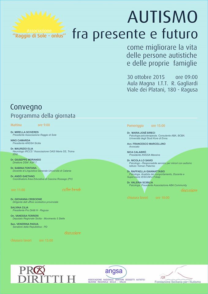 A tale proposito si terrà per l’intera giornata di venerdì 30 ottobre 2015 un Convegno dal titolo “AUTISMO FRA PRESENTE E FUTURO – come migliorare la vita delle persone autistiche e delle loro famiglie” presso l’Aula Magna dell’Istituto Tecnico R. Gagliardi di Ragusa. Il convegno affronterà diversi aspetti legati alla sfera medica, giuridica, scientifica scolastica e dell’intervento abilitativo e informerà su alcune realtà di Centri educativi e abilitativi presenti nel territorio italiano. Tra gli argomenti affrontati dal convegno il nuovo Decreto Legge che riguarda i Livelli Essenziali di Assistenza per le persone con Disturbi dello Spettro Autistico.