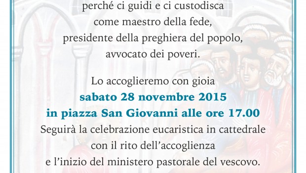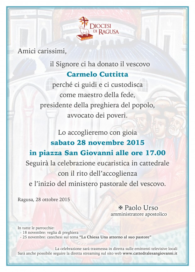 locandina 28 novSabato 28 novembre p.v. alle ore 17,00 in piazza San Giovanni a Ragusa, verrà data festosa accoglienza al nuovo Vescovo,  monsignor Carmelo Cuttitta, al quale saranno rivolti il saluto del Sindaco di Ragusa, ing. Federico Piccitto, anche a nome dei Sindaci dei comuni della Diocesi, e quello di una famiglia della comunità diocesana, a nome di tutta la chiesa locale. Di seguito, dal  Vescovado partirà la processione dei sacerdoti e dei Vescovi fino in Cattedrale per la celebrazione di insediamento del vescovo Carmelo Cuttitta.