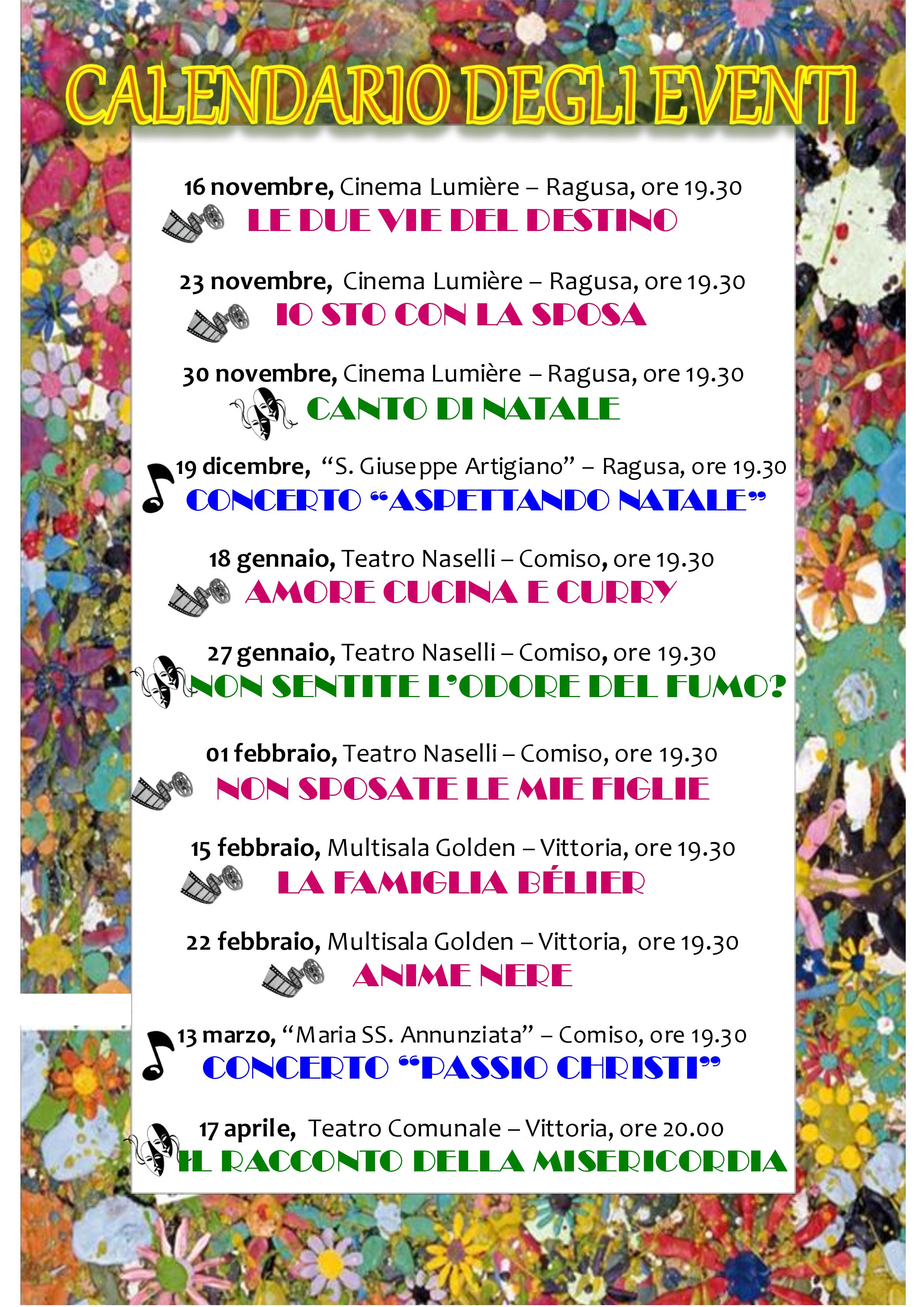 image002Prosegue la rassegna “CULTURA PER LA VITA” organizzata dall’Ufficio per la cultura della Diocesi di Ragusa. Il prossimo appuntamento è con il film “Non sposate le mie figlie”, lunedì 1 febbraio alle ore 20.00 presso il Teatro Naselli di Comiso.