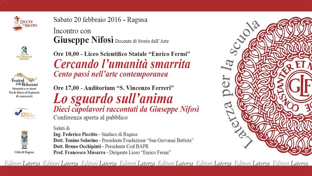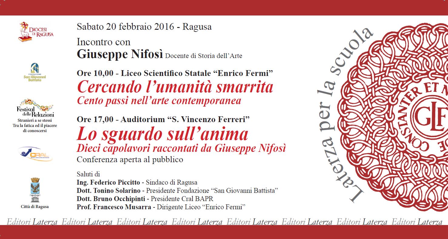 Sabato 20 febbraio 2016 doppio incontro a Ragusa con il professore Giuseppe Nifosì, docente di Storia dell’Arte. Alle ore 10,00, al Liceo Scientifico Statale “Enrico Fermi” tema della conferenza rivolta agli studenti sarà “Cercando l’umanità smarrita. Cento passi nell’arte contemporanea”.