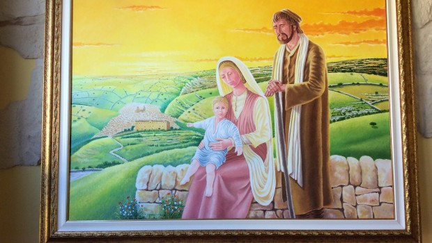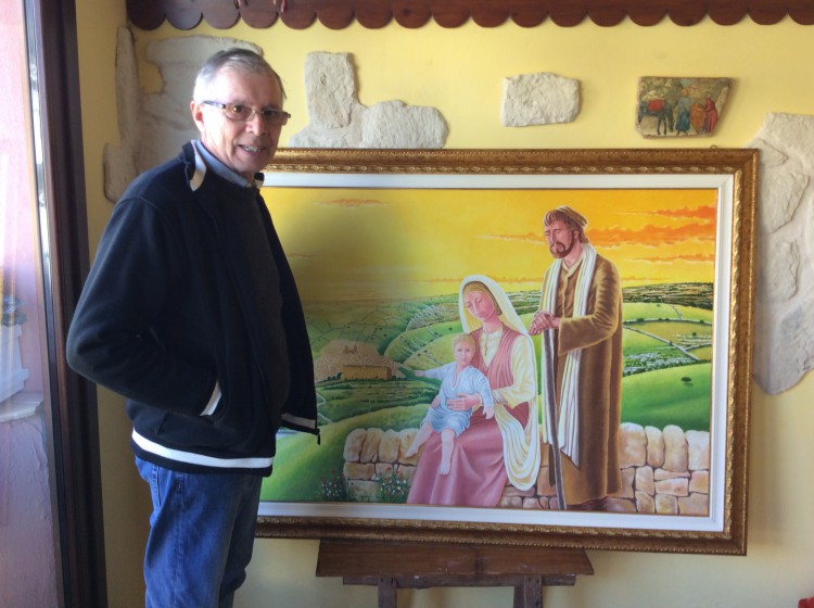 “Il quadro – spiega l’artista – rappresenta la Sacra Famiglia sistemata di fronte a Ibla, dall’altura di San Giacomo. I committenti hanno voluto che si vedesse in primo piano il Convento francescano, in quanto il Vescovo Urso si è dato da fare moltissimo per trasformarlo, dopo che era stato chiuso da decenni, in una scuola di cucina e ristorante. La Madonna è seduta su un muro a secco, tipico delle nostre zone, e sullo sfondo vi è la campagna ragusana alla quale ho voluto conferire un effetto tridimensionale.”