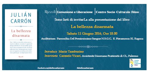 Sabato 11 giugno alle ore 18:00 avrà luogo la presentazione del libro di Juliàn Carròn “La bellezza disarmata”, presso l’Auditorium della Parrocchia del Preziosissimo Sangue di Ragusa.