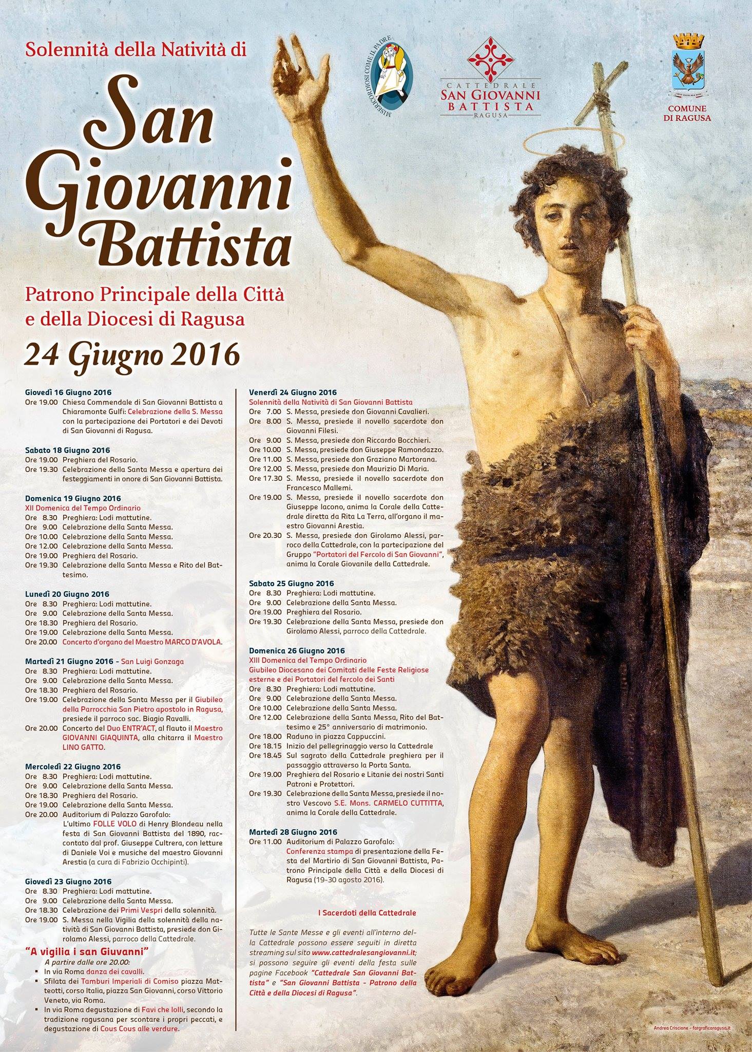 La ricorrenza ricade il 24 giugno, e quest’anno il Comune di Ragusa ha concesso il patrocinio alla Parrocchia Cattedrale San Giovanni Battista che ha promosso delle iniziative culturali in occasione della solennità della natività di San Giovanni Battista in cui sono programmati diversi appuntamenti religiosi.