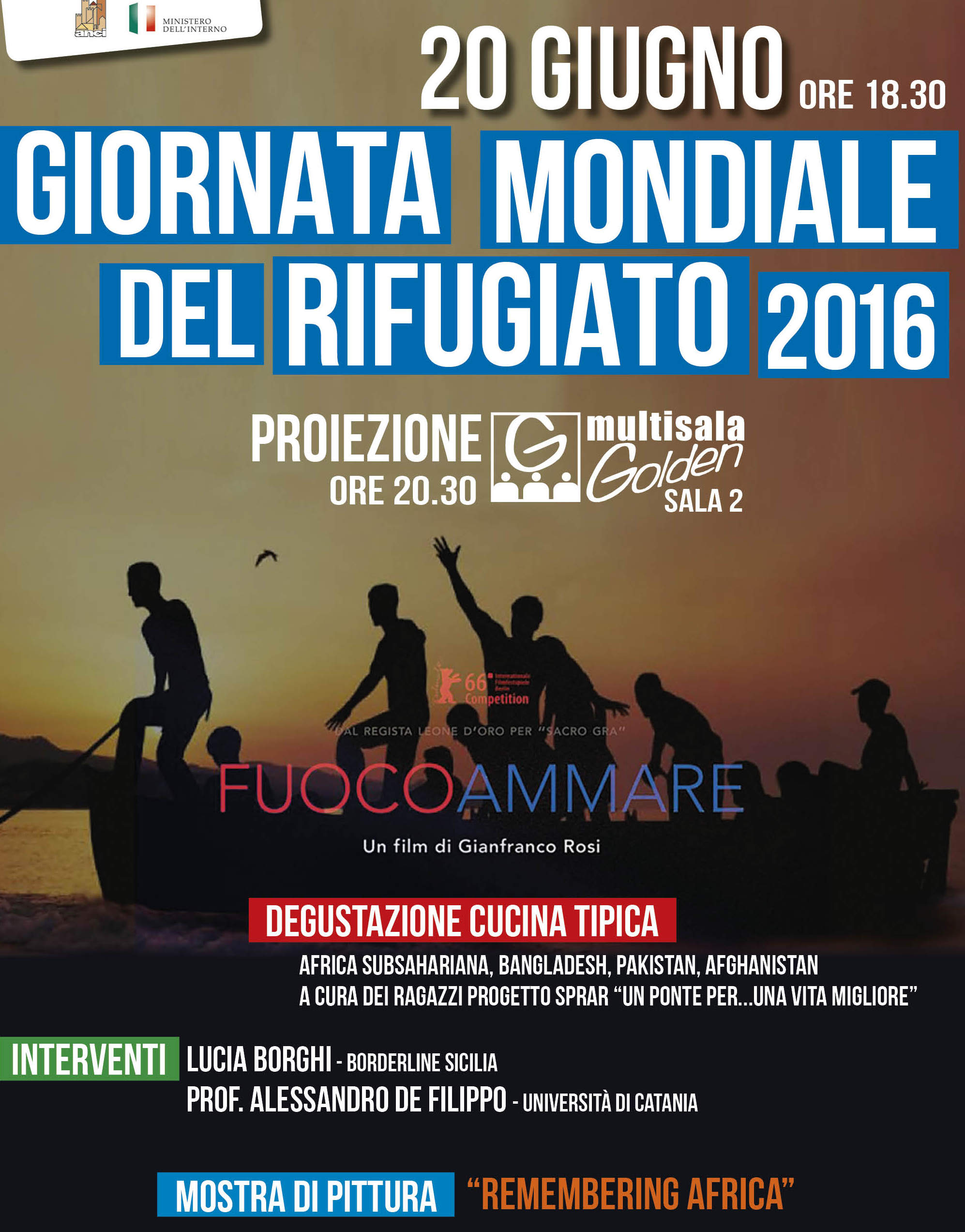 Per la Giornata Mondiale del Rifugiato, a Vittoria le due realtà – e grazie anche ad ulteriori collaborazioni – hanno organizzato un evento all’interno dei locali del cinema Golden, sala 2. Alle ore 18.30 è previsto un dibattito sul tema della doverosa e necessaria accoglienza dei migranti. A seguire, alle ore 20.30, verrà proiettato, per la prima volta in città, “Fuocoammare”, docufilm di Gianfranco Rosi, orso d’oro a Berlino. L’ingresso è gratuito. È previsto inoltre un rinfresco, con la degustazione di piatti tipici africani e mediorientali, cucinati dai ragazzi del progetto.