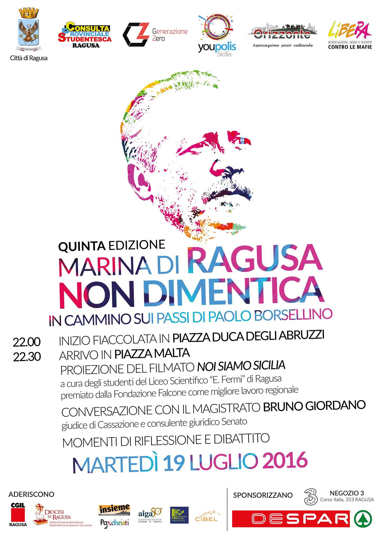 “Ragusa non dimentica – in cammino sui passi di Paolo Borsellino”, è l’iniziativa culturale antimafia che si terrà a Marina di Ragusa il 19 luglio, patrocinata dal Comune di Ragusa e organizzata dal Coordinamento Cittadino dei Movimenti e delle associazioni giovanili.