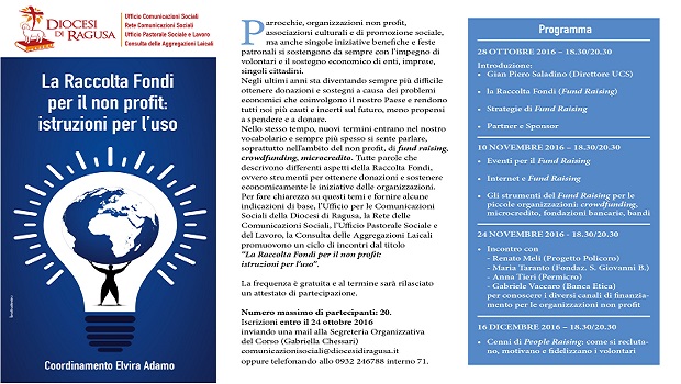 Per fare chiarezza su questi temi e fornire alcune indicazioni di base, la Diocesi di Ragusa tramite la Rete delle Comunicazioni Sociali, l’Ufficio per le Comunicazioni Sociali, diretto da Gian Piero Saladino , l’Ufficio Pastorale Sociale e del Lavoro, diretto da Renato Meli, la Consulta delle Aggregazioni Laicali presieduta da Sebastiano Distefano, promuovono un ciclo di incontri dal titolo “La Raccolta Fondi per il non profit: istruzioni per l’uso”.