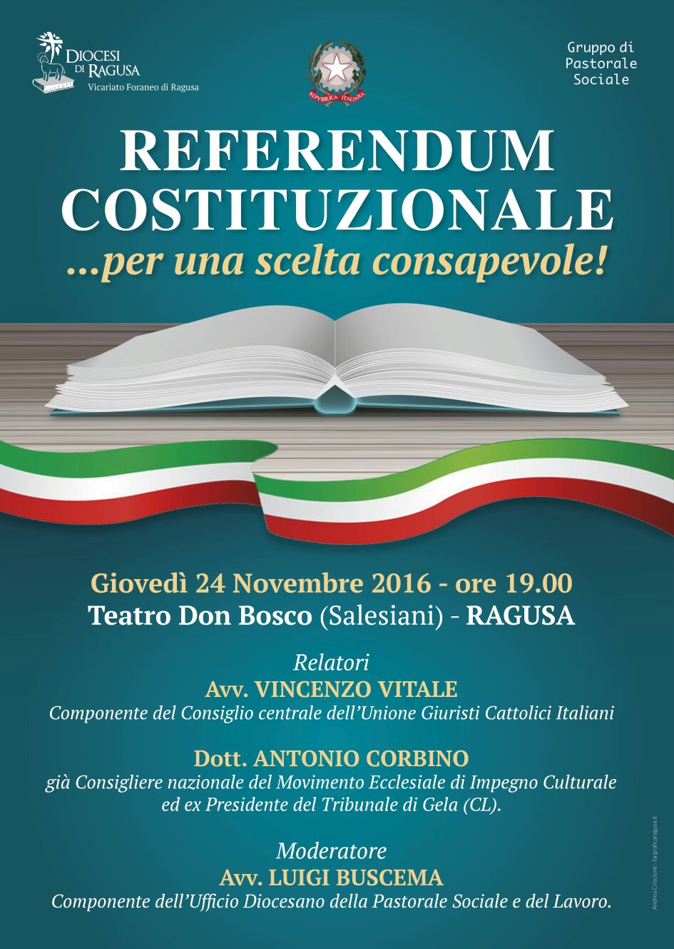 Il Gruppo di Pastorale Sociale del Vicariato di Ragusa, forte dell’invito rivolto da papa Francesco alla Chiesa Italiana, in occasione del Convegno ecclesiale di Firenze – “la Chiesa sia fermento di dialogo, di incontro, di unità”, perché “i credenti sono cittadini” -, promuove un dialogo sui contenuti della riforma costituzionale che vedrà impegnati gli italiani nel referendum del 4 dicembre 2016.