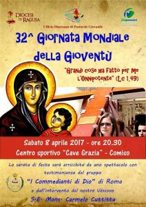 In occasione della 32ª Giornata Mondiale della Gioventù, l’Ufficio Diocesano di Pastorale Giovanile, giorno 8 Aprile alle ore 20.30, presso il “Centro Sportivo Cave Grazia” di Comiso, organizzerà una serata diocesana per i giovani, arricchita da testimonianze, insegnamenti e un suggestivo spettacolo realizzato da un gruppo di ragazzi provenienti da Roma, chiamato “I commedianti di Dio”.