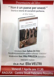Venerdì 7 aprile alle ore 17,30 presso il Centro Studi “Feliciano Rossitto” (Via Ettore Majorana, n. 5 – 97100 – Ragusa) avrà luogo la presentazione del libro di Elio Veltri “Non è un paese per onesti. Storia e storie di socialisti perbene”(Falsopiano editore):introduce il dott. Salvo Di Fini, presidente dell’associazione politico culturale “Itinerari”, moderatore il dott. Vito Piruzza, giornalista, interviene l’autore, On. Prof. Elio Veltri. Prima militante socialista, poi sindaco per caso, ematologo, deputato, polemista instancabile, Elio Veltri è autore di non poche pubblicazioni, come “L’odore dei soldi” (con Marco Travaglio) e “Mafia pulita” (con Antonio Laudati). In buona sostanza, un uomo coerente e fermo nelle sue idee.