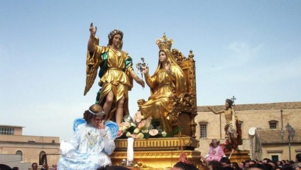 Tutti pronti per la sciuta (uscita) dei simulacri di Gesù Risorto e della Madonna Annunziata. Appuntamento sul sagrato dell’Annunziata per la prima “Paci”. I due simulacri si incontrano e due angioletti (due bambini di circa 11 anni), ai piedi dei due simulacri, intonano il canto del “Regina Coeli”. Subito dopo il canto, i due simulacri vengono lanciati uno verso l’altro, per tre volte, accompagnati dal suono gioioso dell’Inno pasquale. Questo rito di alto valore simbolico, arricchito di tutti gli elementi folkloristici che nel tempo si sono consolidati, si ripete per dodici volte nel corso della giornata, ogni qualvolta la processione giunge nei pressi di una chiesa. La processione è lunghissima, dura 14 ore e si conclude intorno alle due di notte: segna in maniera forte i ritmi e la vita della comunità cittadina. La “Paci” si ripete per ben 14 volte per cui tutta la città, a Pasqua, si ferma per un giorno intero.