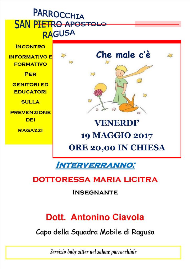 Si svolgerà venerdì 19 Maggio alle ore 20.00, presso la Parrocchia S. Pietro Apostolo a Ragusa, l’incontro informativo e formativo “Che male c’è” incentrato sulla prevenzione dei ragazzi.