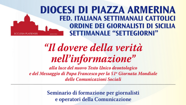 “Il dovere della verità nell’informazione” alla luce del nuovo Testo Unico deontologico e del Messaggio di Papa Francesco per la 51a Giornata Mondiale delle Comunicazioni Sociali è il tema del Seminario di formazione per giornalisti e operatori della Comunicazione che si terrà ad Aidone, nella ex Chiesa S. Francesco, (sede del museo archeologico) sabato 20 maggio.