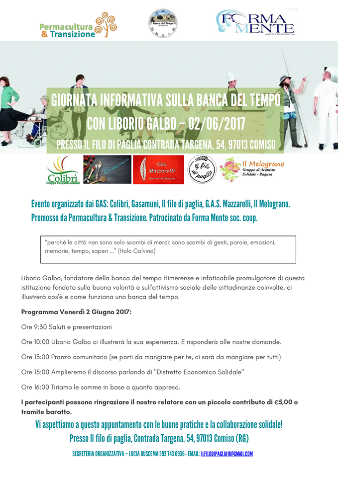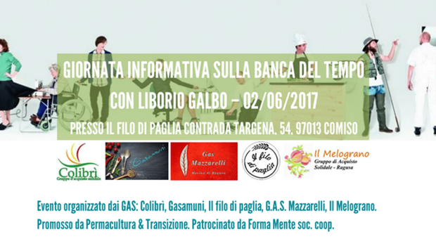 Si terrà il 2 Giugno 2017 presso c.da Targena (Comiso), sede de Il Filo di Paglia, la giornata informativa sulle Banche del Tempo. Ospite dell’incontro sarà Liborio Galbo, co-fondatore della Banca del Tempo Himerense di Termini Imerese.