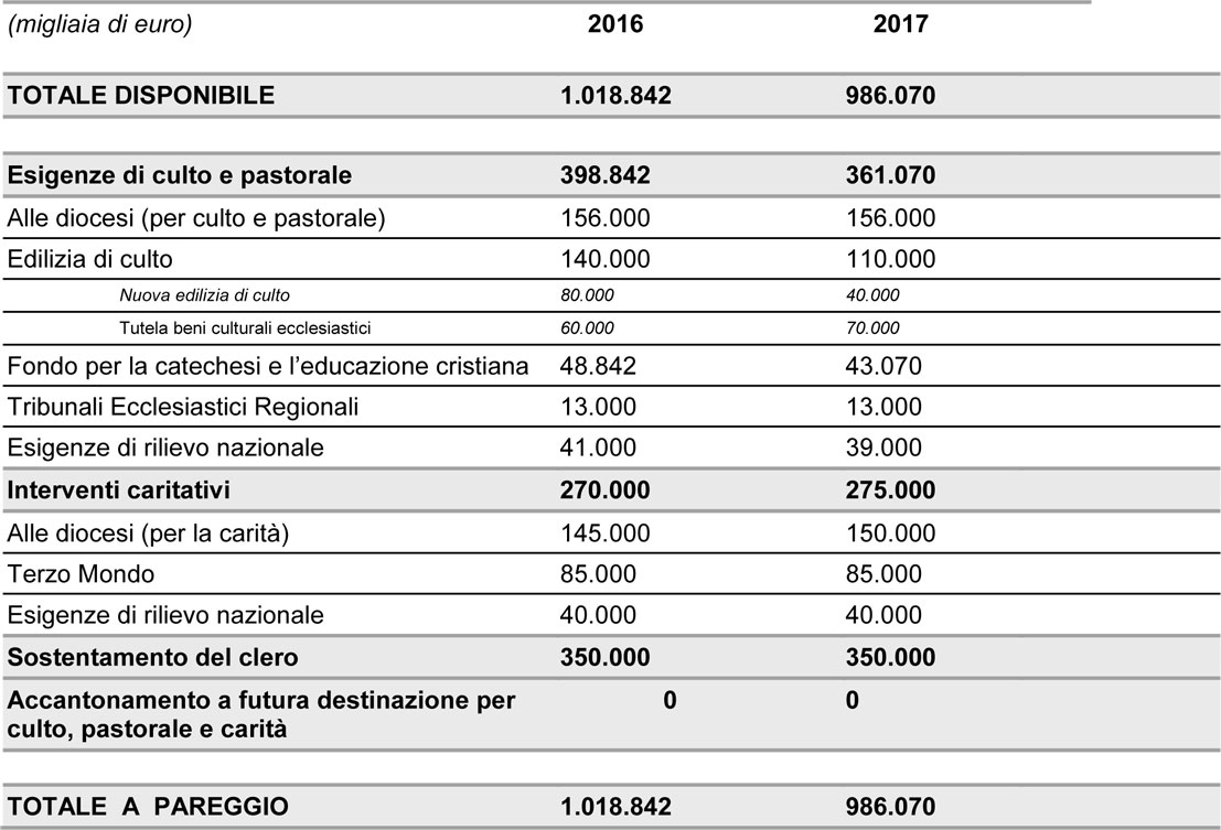 La 70ª Assemblea Generale della Conferenza Episcopale Italiana ha preso atto che, come comunicato dal Ministero dell’Economia e delle Finanze, la somma relativa all’otto per mille dell’IRPEF assegnata alla Chiesa Cattolica per il 2017 risulta pari ad euro 986.070.639 determinati da euro 1.012.493.224 a titolo di anticipo dell’anno 2017, ed un conguaglio sulle somme riferite all’anno 2014, negativo di euro 26.422.585,54.