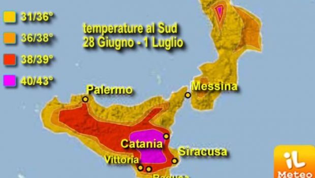 Le aree più colpite dall’ondata di calore saranno soprattutto la Sicilia, la Puglia, diverse aree della Lucania e anche della Calabria. Ma se in alcune aree sono previste temperature infuocate comprese mediamente tra 38 e 39°, è a Catania che si prevdono valori davvero incandescenti con punte fino a 42/44°. Le aree del Catanese, o quelle tra Catania e Caltanissetta, in Sicilia, sono quelle candidate ad avere i valori più infuocati, anche over 42°.