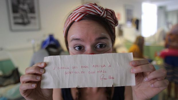 Sorpresi e divertiti, i familiari, gli operatori, gli altri fruitori dell’ospedale che si trovavano in sala d’attesa si sono lasciati coinvolgere dall’allegria dei clown dottori tra piccoli sketch, foto spiritose e persino un “gioco sensoriale”: la ricerca di conchiglie giganti appositamente nascoste in mezzo alla sabbia. “Ascoltate le conchiglie: cosa vi dicono?” hanno poi chiesto i simpatici “dottori dal naso rosso”, invitando i partecipanti a lasciare un messaggio di forza, quella che il mare rappresenta e quella che le conchiglie racchiudono, ai pazienti del reparto. Trascritti su bigliettini e conservati all’interno di alcune bottiglie, i messaggi sono stati così consegnati a caso tra i pazienti, per un attimo distolti dalla continua rincorsa dei loro pensieri e riportati al presente. Un estraneo che parla ad un altro, uno sconosciuto che trasmette la sua forza all’altro: che speciale legame umano si è riusciti a creare!