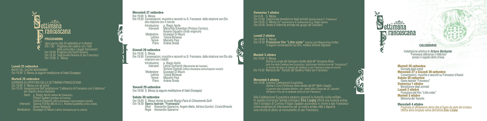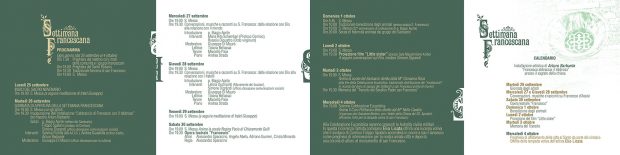 Questa prima edizione si svolgerà dal 26 settembre al 4 ottobre attraverso un serratissimo programma che coniuga spiritualità e cultura a partire dai temi inerenti al cammino della Chiesa locale ed universale, fecondati dall’esempio e l’eredità di Francesco d’Assisi.