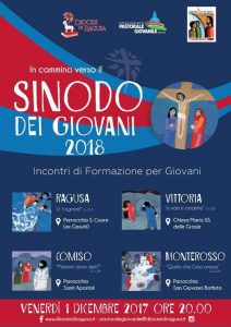 Venerdì 1 dicembre alle ore 20.00 avranno inizio nei quattro vicariati di Ragusa (Parrocchia S. Cuore), Comiso (Parrocchia Santi Apostoli) , Vittoria ( Chiesa Maria SS. delle grazie) e Monterosso (Parrocchia San Giovanni Battista) gli incontri di formazione dei giovani in vista del Sinodo del 2018.