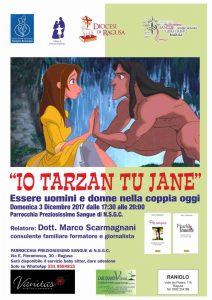 L’Associazione famiglie numerose di Ragusa ha organizzato per domenica 3 Dicembre alle ore 17:30, presso la Parrocchia Preziosissimo Sangue di N.S.G.C. un evento per le famiglie tenuto dal Dott. Marco Scarmagnani, Consulente familiare, formatore e giornalista e presidente del Forum delle associazioni familiari del Veneto, sul tema “Io Tarzan tu Jane – Essere uomini e donne nella coppia oggi”. L’evento è promosso dai responsabili provinciali dell’associazione, Maria Teresa e Paolo Cascone.