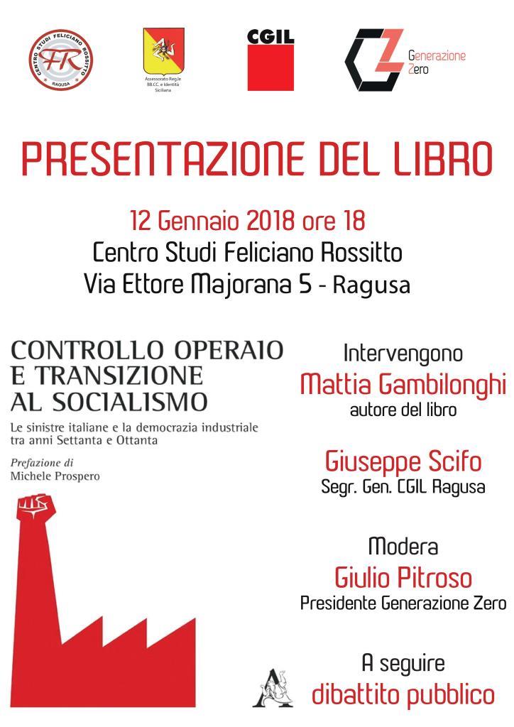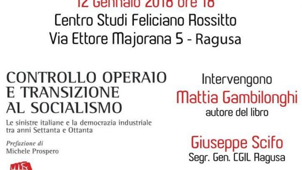 Sarà presentato venerdì 12 gennaio 2018 la monografia “Controllo operaio e transizione al socialismo (Le sinistre italiane e la democrazia industriale tra anni Settanta e Ottanta)” di Mattia Gambilonghi. L’evento si svolgerà alle ore 18.00, presso il Centro Studi “F. Rossitto” (Via Ettore Majorana, 5 – Ragusa).