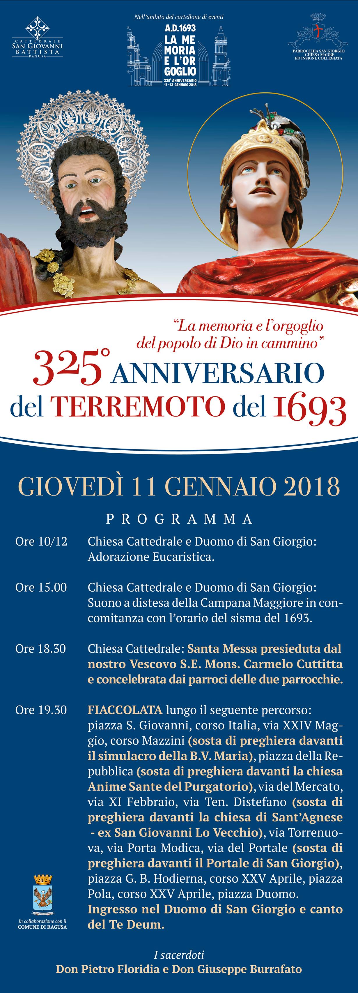 La giornata avrà inizio alle 10: nella Chiesa Cattedrale e nel Duomo di San Giorgio l’Adorazione Eucaristica fino alle 12. Alle 15 le campane maggiori delle due Chiese, come da tradizione, suoneranno a distanza in concomitanza con l’orario del terribile sisma. Alle ore 18.30 in Cattedrale sarà celebrata una Santa Messa, presieduta dal Vescovo Carmelo e concelebrata dai due parroci; seguirà una fiaccolata con il seguente percorso: piazza San Giovanni, corso Italia, via XXIV Maggio, Via Scale (sosta di preghiera davanti il simulacro della B.V. Maria), piazza della Repubblica (sosta davanti la Chiesa Anime Sante del Purgatorio), via del Mercato, via XI Febbraio, via Ten. Distefano (sosta di preghiera davanti la chiesa di Sant’Agnese, ex San Giovanni Lo Vecchio), via Torrenuova, via Porta Modica, via del Portale (sosta di preghiera davanti il Portale di San Giorgio), piazza G.B. Hodierna, corso XXV Aprile, piazza Duomo, con ingresso nel Duomo di San Giorgio e canto del Te Deum.