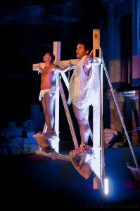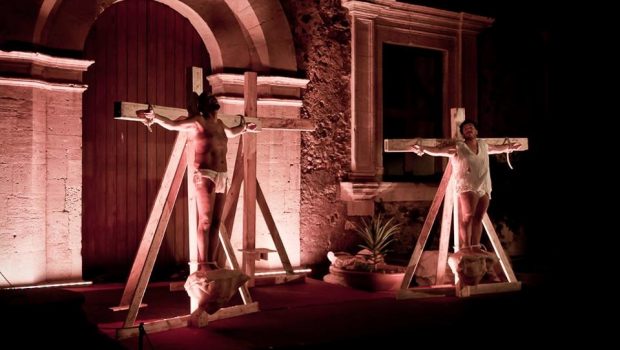 Con “L’alba del terzo Millennio”, quarto appuntamento della stagione di prosa del teatro della contea, ci sarà tanto da ridere, ma anche tanto su cui riflettere e commuoversi. Sul palco tre croci, due delle quali occupate dai “ladroni” di una rappresentazione sacra durante la Pasqua del 2000 in un imprecisato paesino della provincia italiana, che si lasceranno andare ad un dialogo divertente, a tratti spiazzante, ma avviato con difficoltà a causa dell’apparentemente totale incompatibilità caratteriale tra i due. Uno, maestro di scuola elementare, frustrato, rancoroso, laico, scettico, l’altro di professione vinaio, incolto, rozzo, umile e felicemente rassegnato alla vita che conduce. A rappresentarli Emanuele Puglia e Cosimo Coltraro, diretti da Federico Magnano San Lio, autore dello spettacolo è invece Pietro De Silva. Dimenticati dal resto dei compaesani sulle loro croci, perché impegnati a seguire una partita di calcio alla tv, i ladroni riempiranno la scena con la loro immobilità fisica in assoluto contrasto con la vivacità ed incisività di dialogo: una conversazione dapprima rarefatta, stentata, poi via via sempre più sciolta, spesso esilarante ed irresistibile. Tante risate, accompagnate anche da momenti più intensi, per uno spettacolo che rappresenterà in fondo una trasparente metafora di vita, portando a riflettere sulle “croci” che attanagliano la società contemporanea, dominata dalla fretta e dalla latitanza dei valori umani.