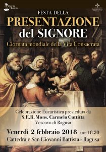 Venerdì 2 febbraio alle 18.30 alla Cattedrale San Giovanni Battista di Ragusain occasione della Festa della Presentazione del Signore Mons.Carmelo Cuttitta celebrerà la Santa Messa.