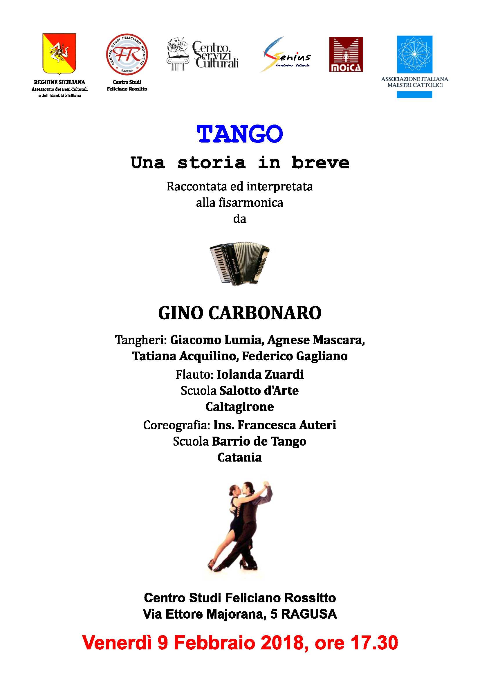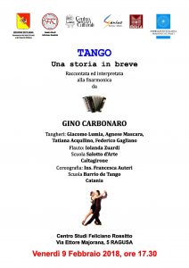 Venerdì 2 febbraio 2018, alle ore 10.00, nei locali del Centro Studi “F. Rossitto”, si terrà una conferenza stampa per illustrare “ Tango. Una storia in breve ”, raccontata ed interpretata alla fisarmonica da Gino Carbonaro.