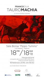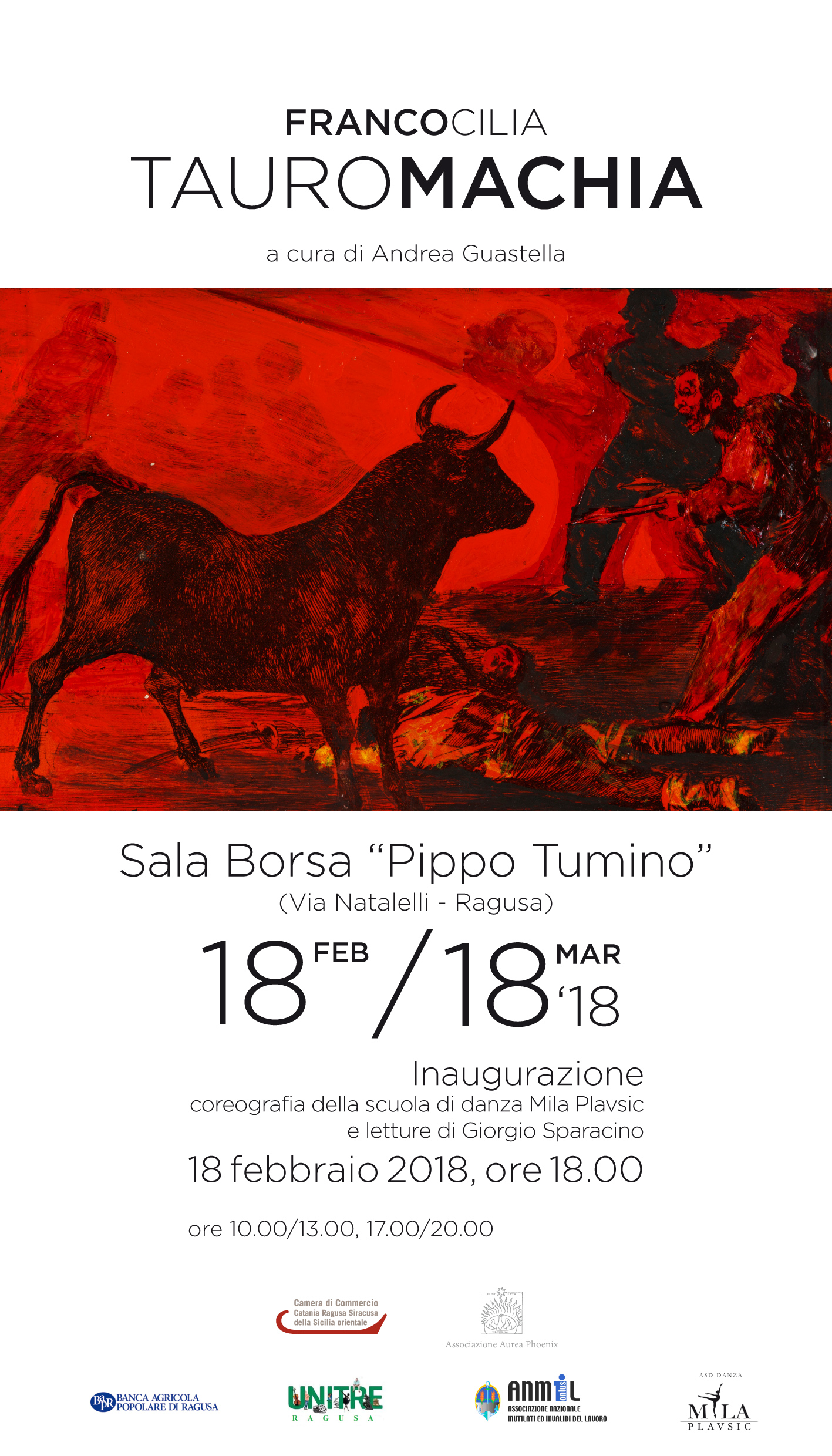 Il notissimo artista ragusano torna a fare ammirare le sue suggestive opere al grande pubblico ragusano. L’appuntamento è per sabato 18 febbraio alle ore 18.00 presso la Sala Borsa “Pippo Tumino” di via Natalelli: sarà il Presidente della Camera di Commercio di Catania Ragusa e Siracusa della Sicilia Orientale Pietro Agen ad inaugurare la mostra di Franco Cilia cui è stato dato il suggestivo titolo di “Tauromachia” e sarà curata dal critico d’arte Andrea Guastella.