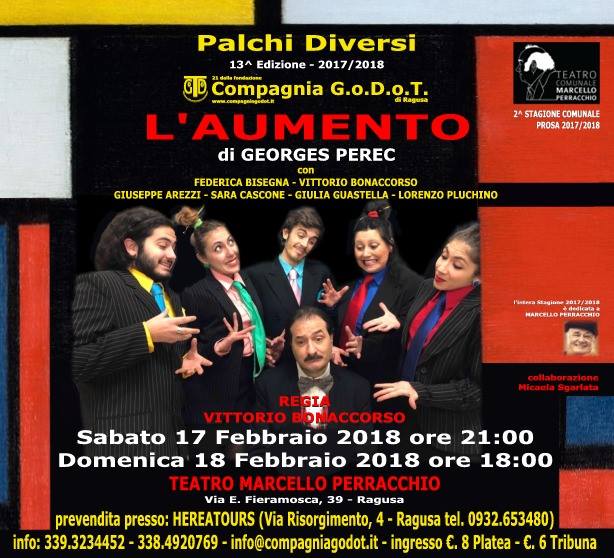 In scena, sabato 17 alle ore 21 e domenica 18 febbraio alle ore 18, la compagnia Godot con “L’Aumento” di George Perec, nell’ambito della stagione artistica 2018 che si tiene presso il teatro comunale Marcello Perracchio, organizzata dal Comune di Ragusa e curata da Massimo Leggio.