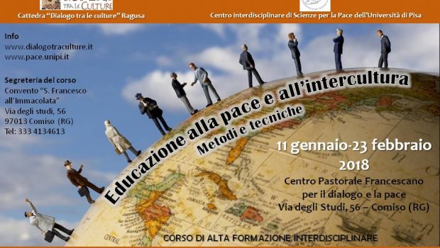 Si conclude giovedì 22 e venerdì 23 febbraio (15.30-19.30) il prestigioso corso di alta formazione “Educazione alla pace e all’intercultura: metodi e tecniche”. L’iniziativa, promossa dalla Cattedra “Dialogo tra le culture” di Ragusa e il Centro interdisciplinare di Scienze per la pace dell’Università di Pisa, si svolgerà presso il Centro Pastorale Francescano per il dialogo e la pace di Comiso. Formatore dei due pomeriggi di giovedì e venerdì sarà il prof. Andrea Valdambrini.