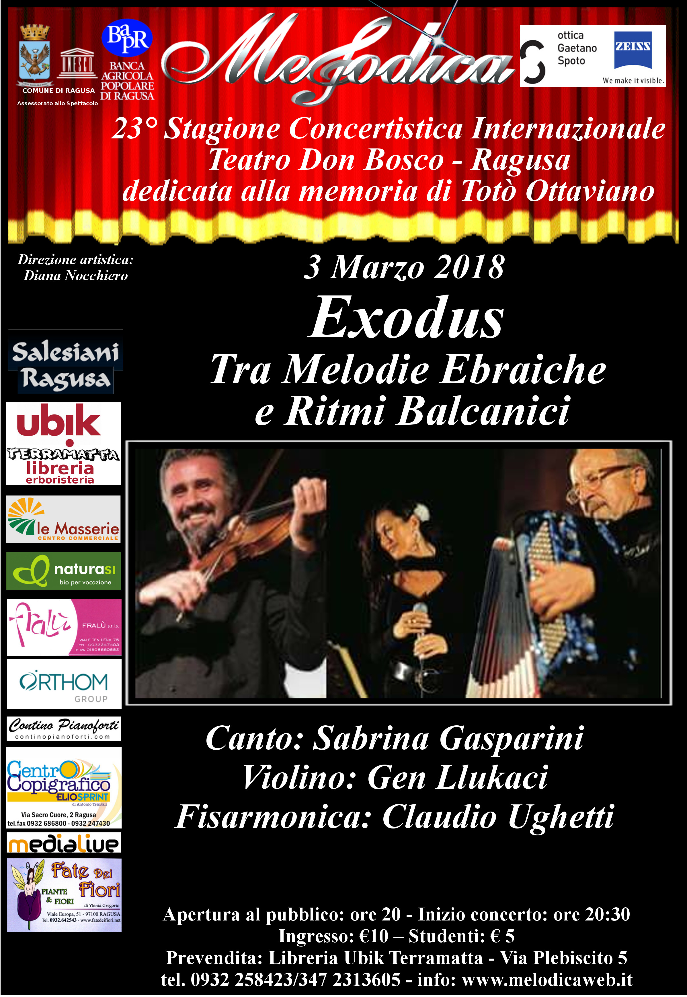In occasione della 23° Stagione Concertistica Internazionale “Melodica”, sabato 3 marzo alle ore 20:30 al Teatro Don Bosco si esibirà il “Trio d’Autore” (Sabrina Gasparini alla voce, Gen Llukaci al violino, Claudio Ughetti alla fisarmonica), nello spettacolo “Exodus” – Melodie ebraiche e i ritmi balcanici.