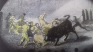 In questa esaustiva rassegna d’arte, emblematicamente intitolata Tauromachia, Franco Cilia – così come Picasso, Dalì o Goya – fa dell’eterna lotta tra l’Uomo e Bestia, nella fattispecie tra lui e il toro, quasi la sua ragion d’essere in uno spazio temporale oltremodo importante del suo lungo essere artista. E stranamente, in contrapposizione a quanto avviene della Plaza de Toros, questa volta ad avere la meglio è proprio il toro, espressamente rappresentato in diversi quadri dove si vede il Cilia steso a terra immobile, morto, e l’animale troneggiante su di lui a rimarcare una sfida all’ultimo sangue da lui combattuta e vinta. In questa esposizione sono tanti i riferimenti a Goya che “..in effetti è il maestro cui Franco ha guardato con più attenzione nell’intera sua carriera – dice il Guastella – , a partire dagli anni settanta sino alle soglie del duemila, poi per qualche tempo altri autori hanno calamitato il suo interesse ma senza che i rimandi a Goya calassero di intensità”. E Franco Cilia ha saputo rendere suoi i momenti vissuti idealmente con il grande artista spagnolo e lo ha fatto con creazioni che affascinano già al primo impatto visivo, anche senza entrare nella vera essenza dell’opera.
