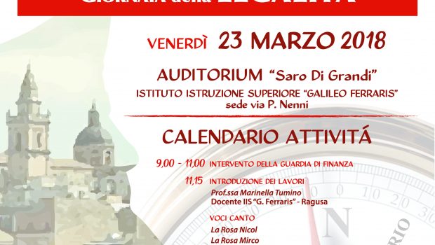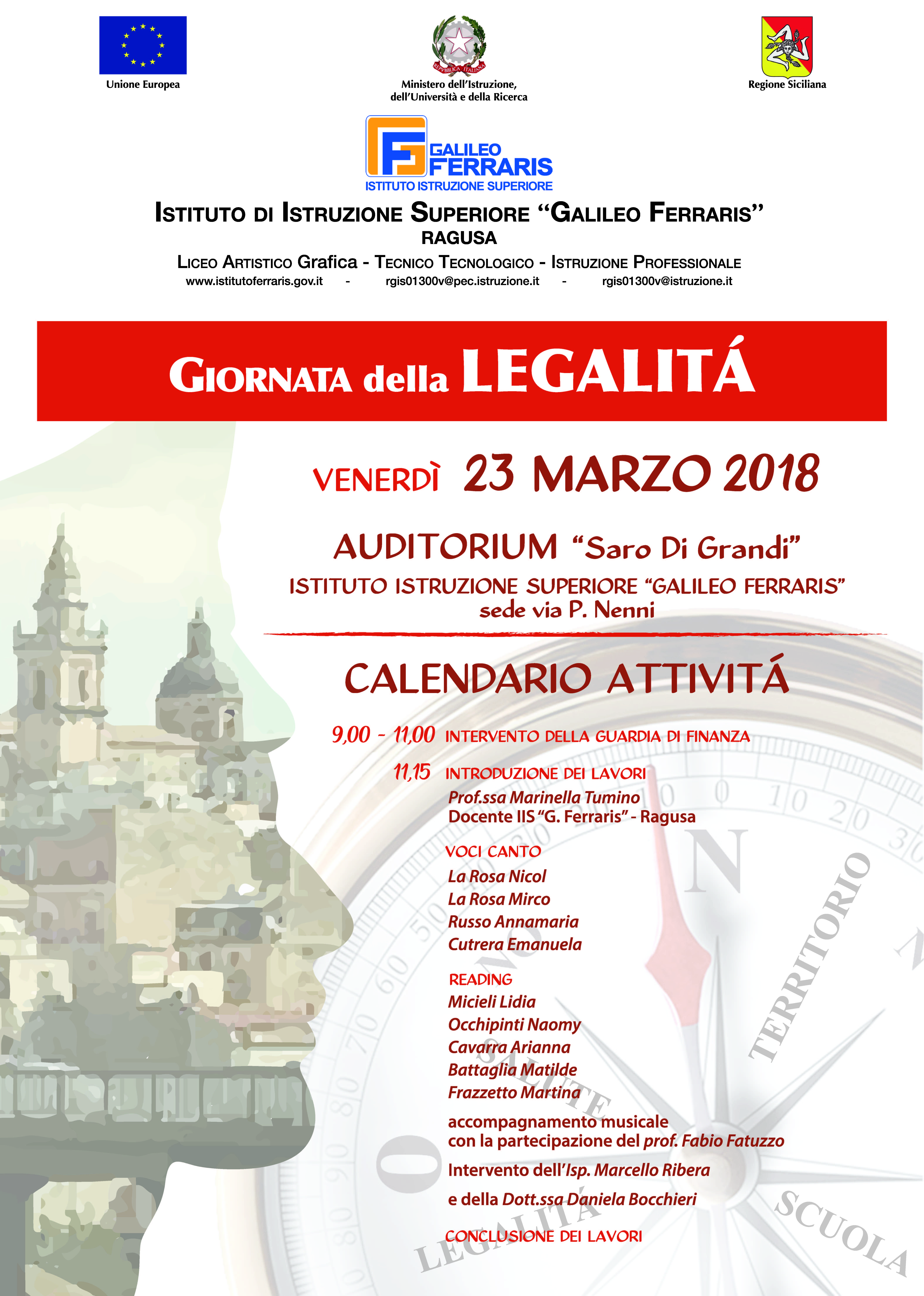 Si svolgerà venerdì 23 Marzo p.v. la Giornata della Legalità che vedrà coinvolti in diverse attività gli studenti dell’istituto “Galileo Ferraris” di Ragusa.