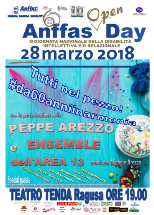 Per l’occasione Anffas Onlus di Ragusa organizzerà il 28 marzo alle ore 19, presso il Teatro Tenda, una grande festa per ripercorrere i grandi temi che formano le basi del pensiero Anffas: sarà una grande festa di musica cui parteciperanno numerosi artisti. L’organizzazione dell’evento vede l’entusiastica partecipazione del maestro Peppe Arezzo.
