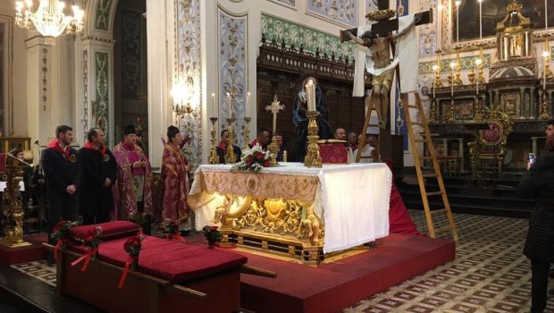 E’ un rituale molto particolare che fa seguito alla domenica delle palme e della Passione del Signore, e che ha dato il via alla Settimana santa 2018. E’ stato il parroco don Antonio Maria Forgione a celebrare la solenne Eucaristia , subito dopo il sacerdote Gianluca Belfiore, giurista e assistente diocesano Acr dell’arcidiocesi di Siracusa, ha guidato la fase successiva del rito. Il simulacro del Cristo viene calato dalla Croce, dopo che, uno dopo l’altro, si staccano i tre chiodi (i due delle mani, l’altro collocato ai piedi): prima, però, viene tolta la corona di spine. A seguire il corpo, appena deposto, viene trasportato su una lettiga all’interno della cappella palatina e qui disposto per l’adorazione dei fedeli, accanto al simulacro della Madonna Addolorata. Si tratta di una cerimonia molto particolare che non a caso è stata seguita con estremo fervore. Il tutto, tra l’altro, in un contesto architettonico unico, quale quello della cappella Cabrera , sopravvissuta al terremoto del 1.693 e incastonata nella nuova architettura settecentesca. I fedeli, dopo la santa messa, uno dopo l’altro hanno voluto manifestare il proprio dolore rendendo omaggio al simulacro del Cristo. Conclusa la cerimonia, il simulacro è stato risistemato nella cappella a destra dell’altare maggiore. Al termine della santa messa, don Forgione ha ricordato gli appuntamenti principali della Settimana santa a cominciare dalla messa crismale che giovedì 29 marzo, alle 9, si terrà nella Cattedrale San Nicolò a Noto. La funzione sarà presieduta dal vescovo, mons. Antonio Staglianò. Nello stesso pomeriggio, poi, alle 19, nella chiesa di Santa Maria di Betlem, è in programma la messa “In coena domini” con il rito della lavanda dei piedi, poi ci sarà la solenne processione interna fino alla cappella della Reposizione. Sempre giovedì, ma alle 22, si terrà l’ adorazione eucaristica comunitaria. E’ da dire che gli appuntamenti tradizionali che culmineranno domenica con “A Maronna Vasa Vasa” sono sostenuti dall’Amministrazione comunale, Confcommercio provinciale Ragusa, invece, si sta occupando di curare la comunicazione esterna e tale intervento viene sottolineato dal presidente provinciale Gianluca Manenti e del presidente della sezione cittadina dell’Ascom, Giorgio Moncada : “ Riteniamo che un appuntamento del genere, al di là delle ricadute prettamente religiose, meriti di essere esaltato all’ennesima potenzia grazie al fascino che il rinnovarsi della tradizione riesce ad emanare”.