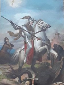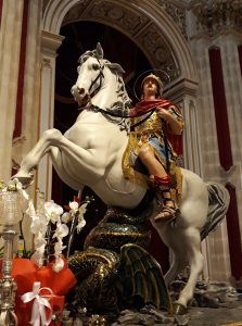 “I santi che già sono giunti alla presenza di Dio mantengono con noi legami d’amore e di comunione” (n. 4), i ragusani, in particolare, siamo invitati a rivedere in un’ottica diversa la venerazione verso questo santo, tanto caro alla cristianità; sicuramente sarà stato proprio questo legame affettivo ed effettivo di amore e di comunione che i nostri padri con gioia lo hanno scelto come Patrono e Protettore della città di Ragusa e che noi forse non comprendiamo appieno. In fondo non è stata una scelta infruttuosa: Gesù, lasciandoci il ‘Padre Nostro’, ci ha insegnato a chiedere ogni giorno la liberazione dal potere dominante e prepotente del Maligno (cf. n. 160), una richiesta che può essere affiancata dall’intercessione e dalla protezione dei santi; l’invitto Cavaliere, in tal senso, è speranza, sprono e ausilio. Tele e statue in suo onore ce lo ricordano, a noi la bravura nel saper leggere e imitare la profondità di questa santità vittoriosa e gioiosa.