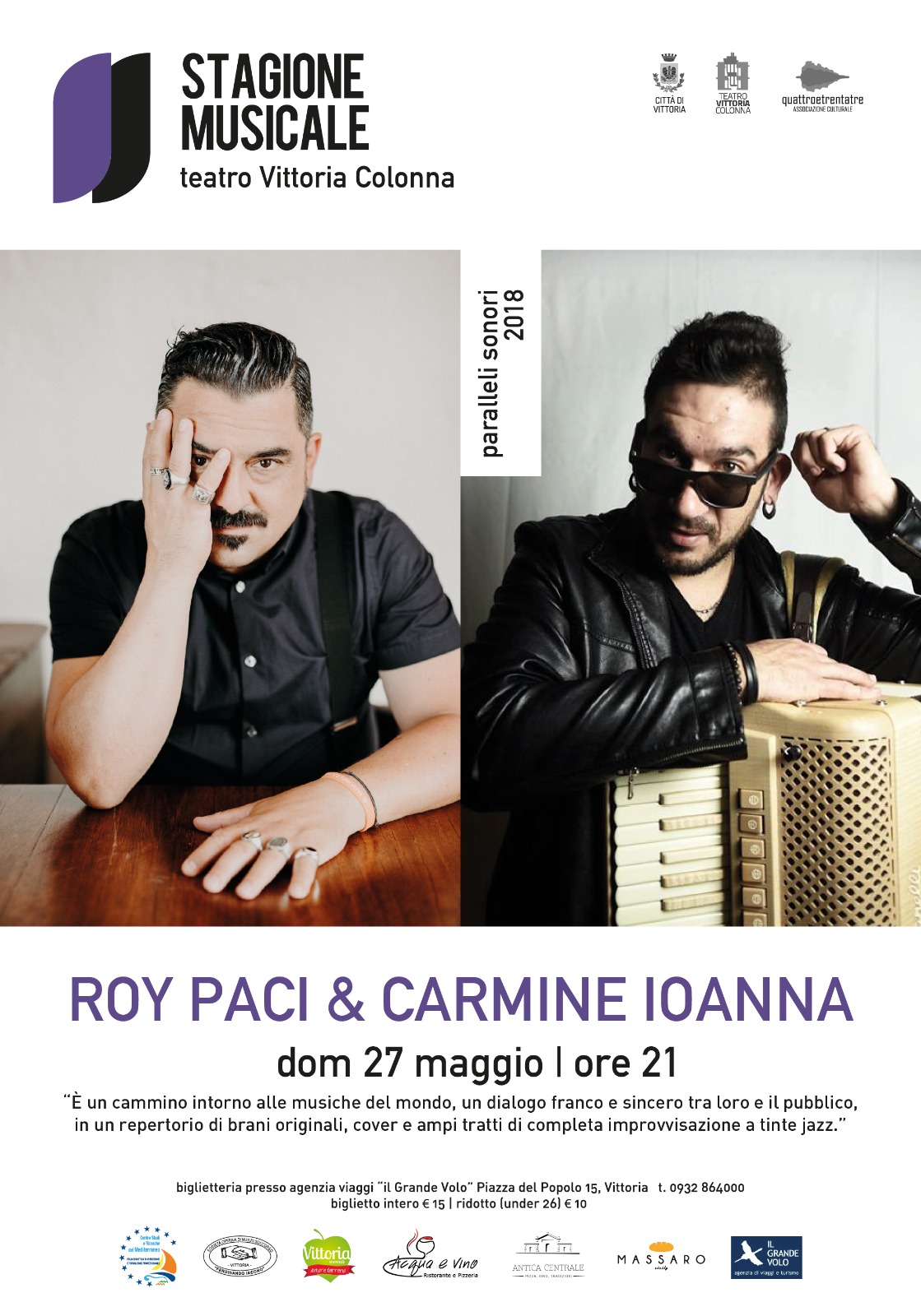 La stagione “Paralleli sonori” è curata dall’associazione culturale Quattroetrentatre, presieduta da Claudio Zarba, e dal Comune di Vittoria. Per info e biglietteria agenzia di viaggi “Il Grande Volo” a Vittoria.