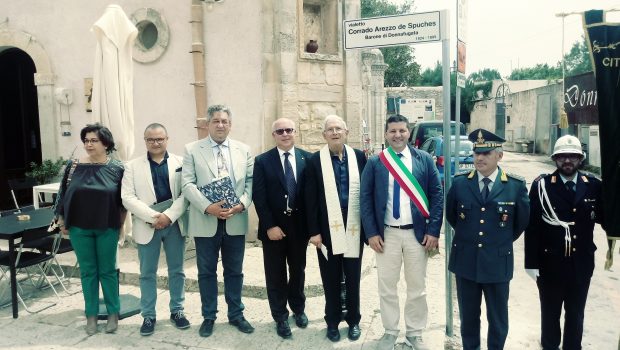 Stamani infatti si è svolta presso l’antìco maniero di proprietà comunale, la cerimonia di intitolazione a cui sono intervenuti oltre al sindaco Federico Piccitto, gli assessori Nella Disca e Gianluca Leggio, il consigliere comunale Filippo Spadola,  l’architetto Nuccio Iacono che ha proposto all’Amministrazione comunale di intitolare all’illustre concittadino il viale del Castello, il dott. Giovanni Scucces in rappresentanza della famiglia Arezzo, il Commissario Alessandro Casiraro della Questura di Ragusa ed il comandante di Compagnia della Guardia di Finanza, Capitano Antonio Schiazza.