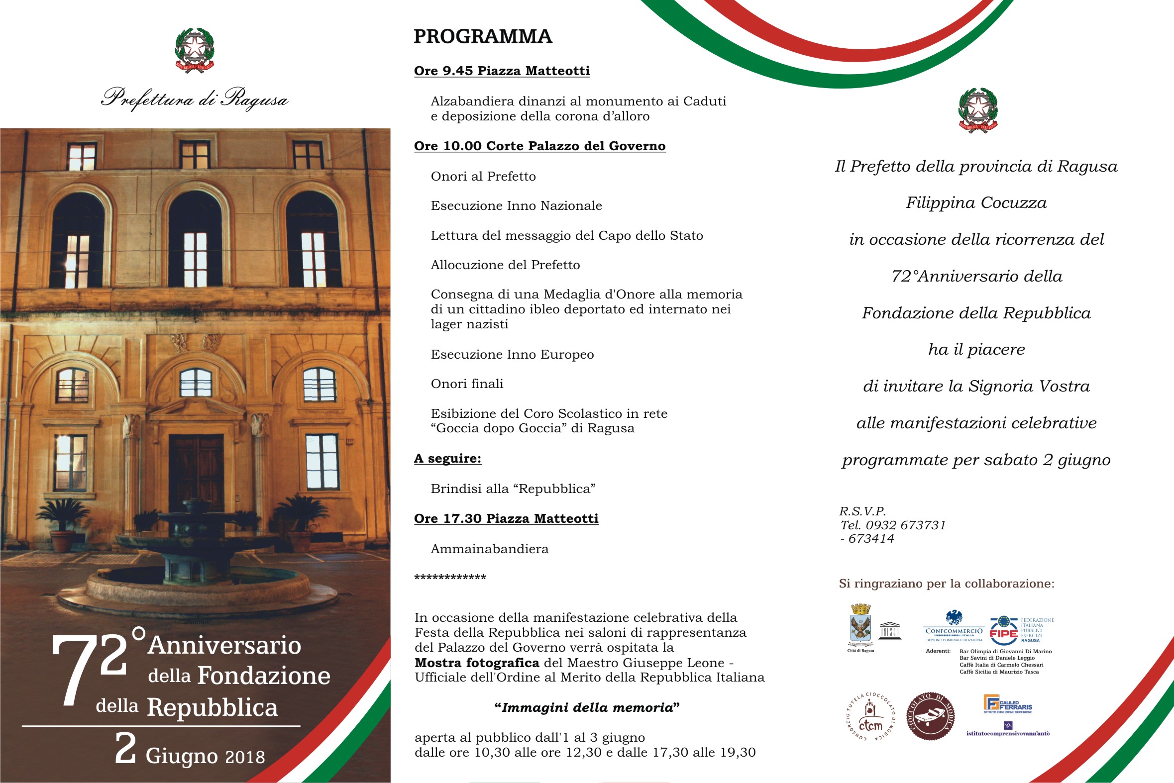 Il prossimo 2 giugno in occasione del 72° Anniversario della Fondazione della Repubblica, avrà luogo a Ragusa la tradizionale manifestazione celebrativa, con inizio alle ore 9.45 in Piazza Matteotti dove dinanzi al Monumento ai Caduti si svolgerà la cerimonia dell’alzabandiera e successivamente la deposizione di una corona d’alloro.