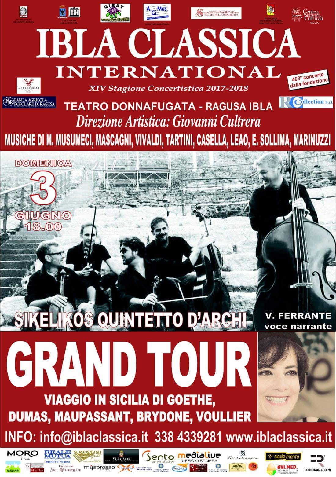 Con il concerto “Grand Tour, Viaggio In Sicilia Di Goethe, Dumas, Maupassant, Brydone, Voullier” domenica 3 giugno, alle ore 18.00, al Teatro Donnafugata di Ragusa Ibla, un altro imperdibile appuntamento con la prestigiosa stagione concertistica “Ibla Classica International”, con la direzione artistica di Giovanni Cultrera e promossa dall’associazione Agimus (presidente Marisa Di Natale). Si tratta dell’ultimo concerto al teatro ibleo, mentre la stagione si chiuderà il 24 giugno prossimo all’Auditorium Ferreri.
